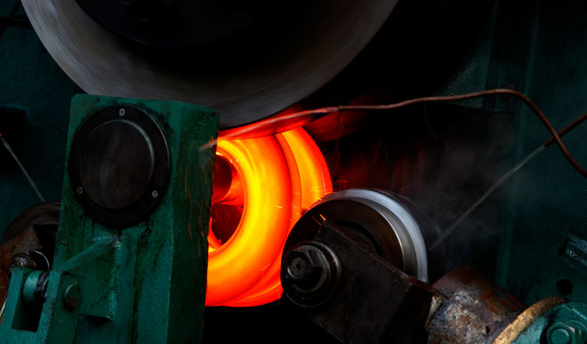 (2)鍛壓、碾壓復合成型工藝生產(chǎn)的車輪產(chǎn)品輪孔和輪槽是在壓力作用下碾壓成型的,原材料受到充分利用。與傳統(tǒng)的鍛壓成型工藝比較明顯的降低了原材料消耗,有利于降低成本,提高產(chǎn)品市場競爭力;